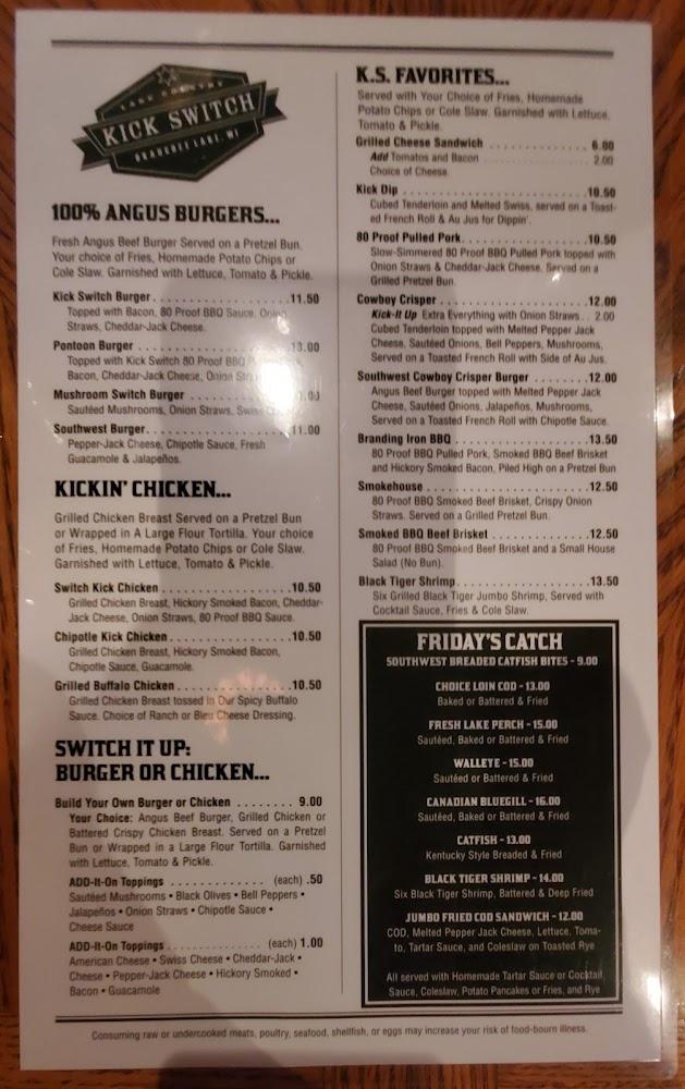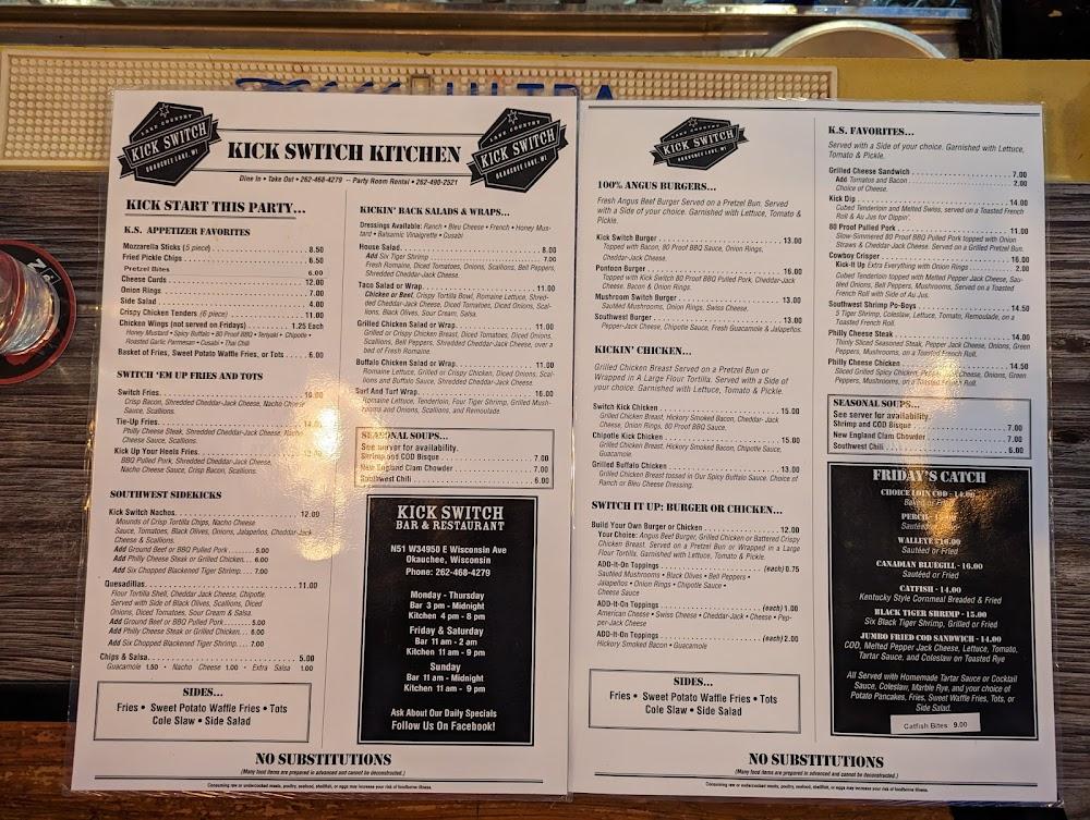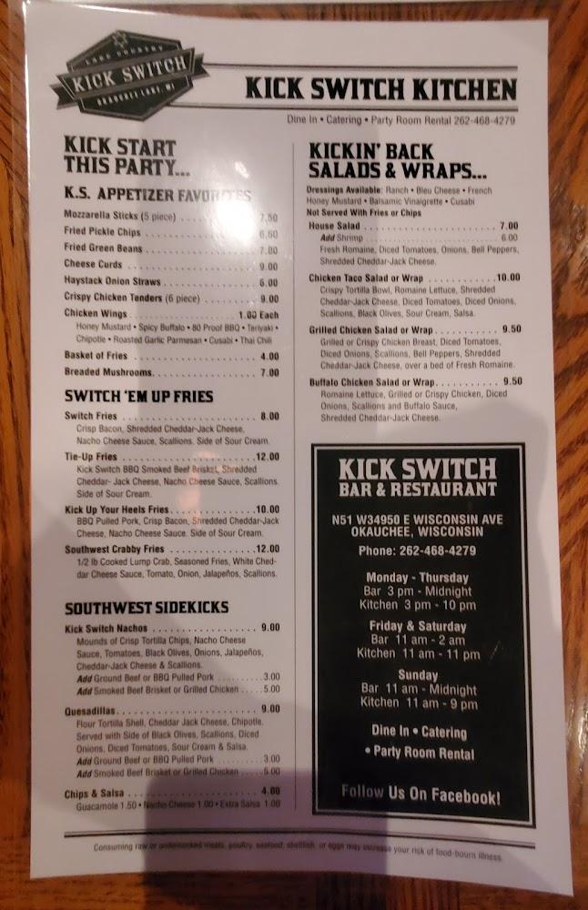 Welcome to Kick Switch Bar And Grill, your go-to destination in Okauchee, WI, for an unforgettable dining experience. Enjoy a vibrant atmosphere with live concerts and a wide selection of local specialties, cocktails, and craft beers. Whether you’re looking for a cozy place to enjoy lunch or a lively spot for dinner, our welcoming space includes both indoor and outdoor seating, with amenities accessible for everyone. Indulge in our happy hour deals, shareable plates, and quick service in a setting perfect for solo diners or gatherings with friends. Join us for good food, great drinks, and exciting sports events!
